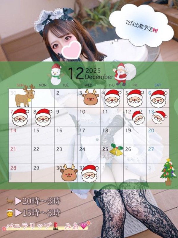 お兄様、こんばんわ?明日から出勤のみあです??12月の出勤カレンダーが出来たのでお知らせです???出勤日は??さんのスタンプがついてる所にな…
